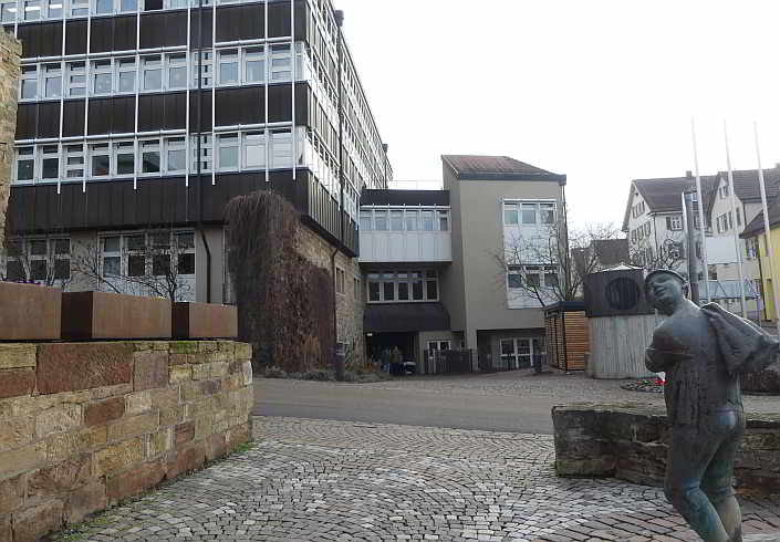 Von der Wagnerstraße kommend führt ein stufenloser Weg zum Nebeneingang Rathaus und der öffentlichen WC-Anlage.