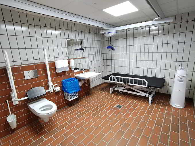 Die rund 12 qm große Rollstuhl-Toilette a ist zusätzlich ausgestattet mit einer frei stehenden höhenverstellbaren Pflegeliege für Erwachsene (abklappbares Seitengitter), einem Deckenlifter (Hebetuch nicht vorhanden) sowie einem luftdicht verschließbaren Windeleimer. Sie ist mit Euro-Schlüssel 24/7 zugänglich.