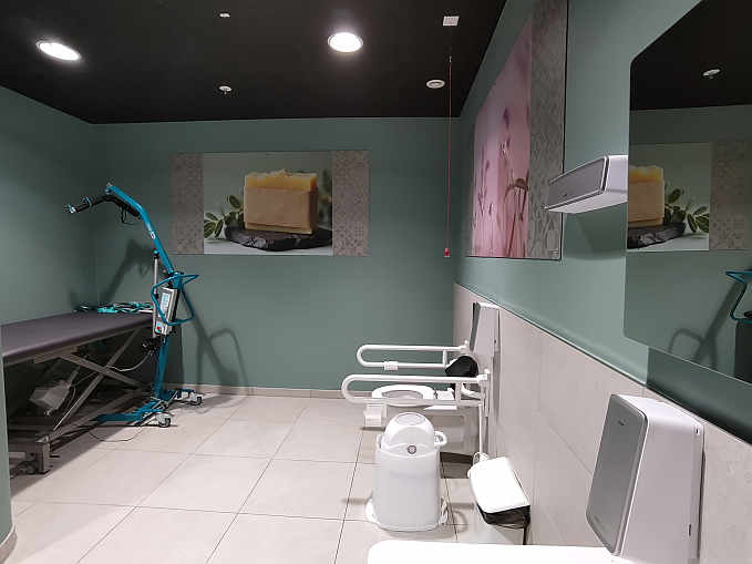 Seit zehn Jahren fördere das Land Baden-Württemberg als einziges Bundesland freiwillig die erforderliche Zusatzausstattung – höhenverstellbare Pflegeliege für Erwachsene, Patientenlifter für den Transfer vom Rollstuhl auf die Liege und zurück sowie luftdichten Windeleimer – mit 90 Prozent Zuschuss, maximal 12.000 Euro, berichtete Jutta Pagel-Steidl, Geschäftsführerin des Landesverbandes für Menschen mit Körper- und Mehrfachbehinderung Baden-Württemberg. Der Selbsthilfeverband berät im Auftrag des Ministeriums für Soziales, Gesundheit und Integration von der Planung bis zur Umsetzung. Das Land habe die Stadt Rheinstetten mit 12.000 Euro gefördert. Ein solches Serviceangebot sei ein wichtiger Baustein für Inklusion vor Ort. „Nachdem es seit vielen Jahren bei der Messe bereits ein solches Serviceangebot gibt, ist es ein richtiger Schritt, nun auch an an zentraler Stelle in der Neuen Stadtmitte eine „Toilette für alle“ zu haben – und nur wenige Meter von der barrierefreien Bahnhaltestelle „Rösselsbrünnle“ entfernt. „Wir schätzen, dass rund 380.000 Menschen in Baden-Württemberg aufgrund von Alter, Krankheit oder Behinderung inkontinent sind. Doch nur wenige sprechen darüber, weil es für viele noch immer ein Tabu ist“, so Pagel-Steidl.